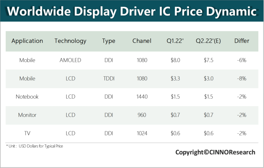 2022年第二季度,全球新冠疫情重复、俄乌战役形势仍严重,致消费端需求疲软、通胀高企,全球显现驱动芯片价格也呈现下降拐点。依据CINNO Research数据显现,2022年第二季度全球显现面板驱动芯片DDIC价格降幅约在2-8%,第三季度价格降幅或将持续扩展至4-15%。