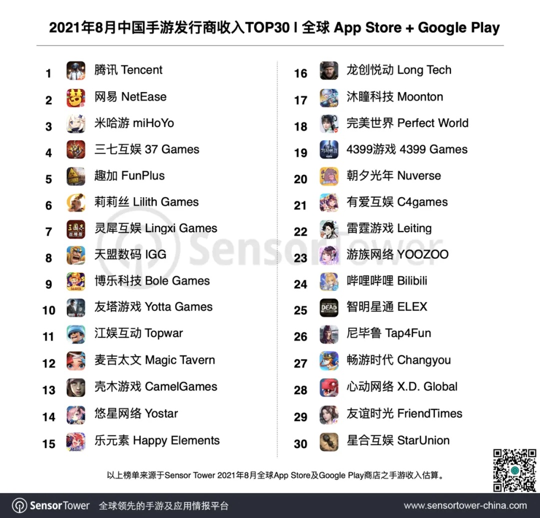 2021 年 8 月中国手游发行商全球收入排行榜:腾讯网易米哈游前三