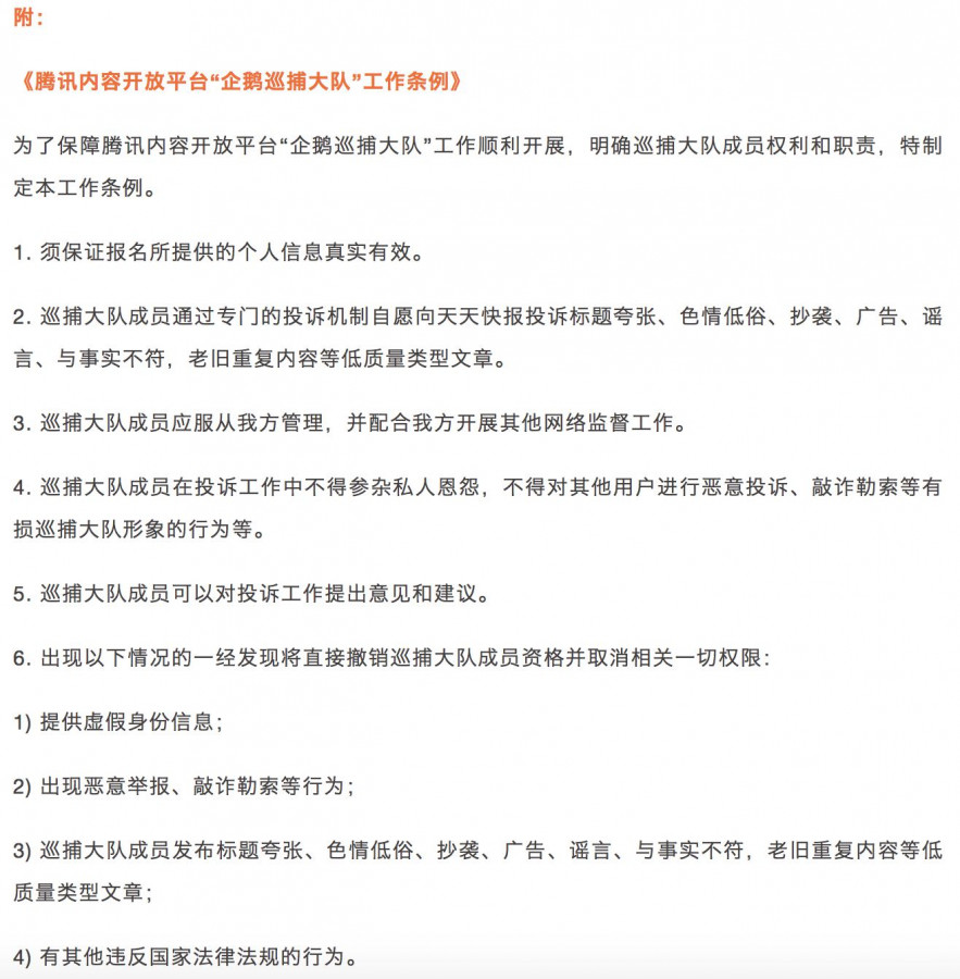 ”队员,报名日期从上月29日开端,到1月5日。此举旨在为旗下天天快报的内容进行检举,队员经过专门的投诉机制自愿向天天快报投诉标题夸大、色情低俗、抄袭、广告、流言、与现实不符,老旧重复内容等低质量类型文章。据了解,腾讯此次招募“企鹅巡捕大队”的门槛不低。其间,包括来自媒体的记者、修改10人;企鹅号作者70人,信誉分70分以上,无严重违规记载,企鹅号账号指数5000以上;一般网友120人,需求了解互联网法律法规,关怀互联网安全健康发展,可以辨认营销、低俗、色情、流言、旧闻、标题党等低质内容。
