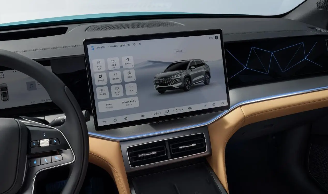 进入车内,以宋代院子艺术为创意的宋韵宽奢座舱映入眼帘。贯穿式一体化面板与中置旋转悬浮Pad构成参差有序布局,极富层次感。副驾智能3D景深气氛灯光影变幻、呼吸崎岖、层层有景。31色气氛灯改换随心,调配金沙陶内饰配色,一展大宋气韵之美,实力诠释中式奢华新魅力。