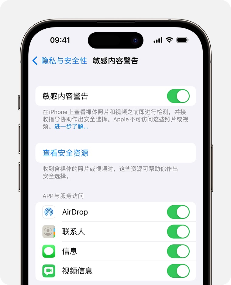 默许情况下,“灵敏内容正告”处于封闭状况。翻开“灵敏内容正告”后,你能够挑选将哪些 App 和服务与这项功用调配运用。